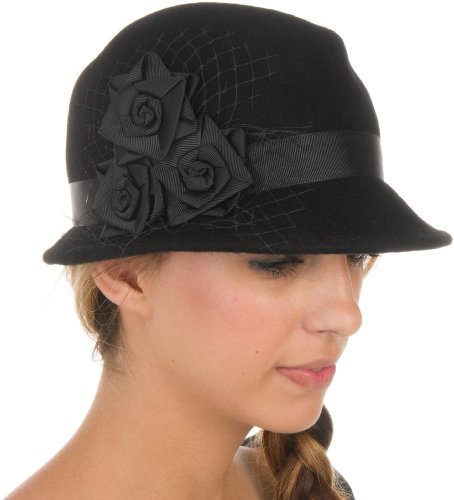 Sakkas EH1941LC - Chapeau Cloche Femmes Hiver Style Rétro 100% Laine avec Fleur - Noir/Taille Unique
